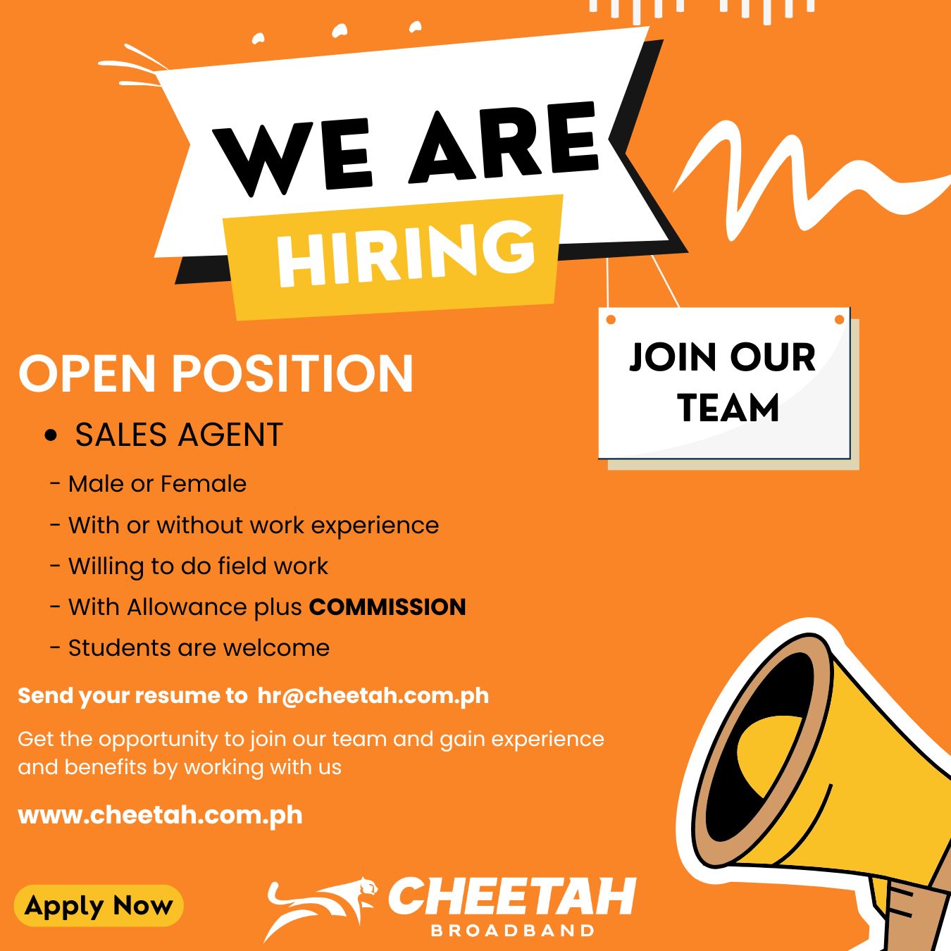 Open Position:SALES AGENTMale or FemaleWith or without work experienceWilling to do field workWith Allowance plus COMMISSIONStudents are welcomeIf you're one of those people, we want to hear from you!Submit your resume to hr@cheetah.com.ph or any of our branches.#JoinOurTeam #TrustedCheetahPartner #Rizal #BCTV #SkylineCATV #KabayanCable #Rizaleños #CheetahBroadband...