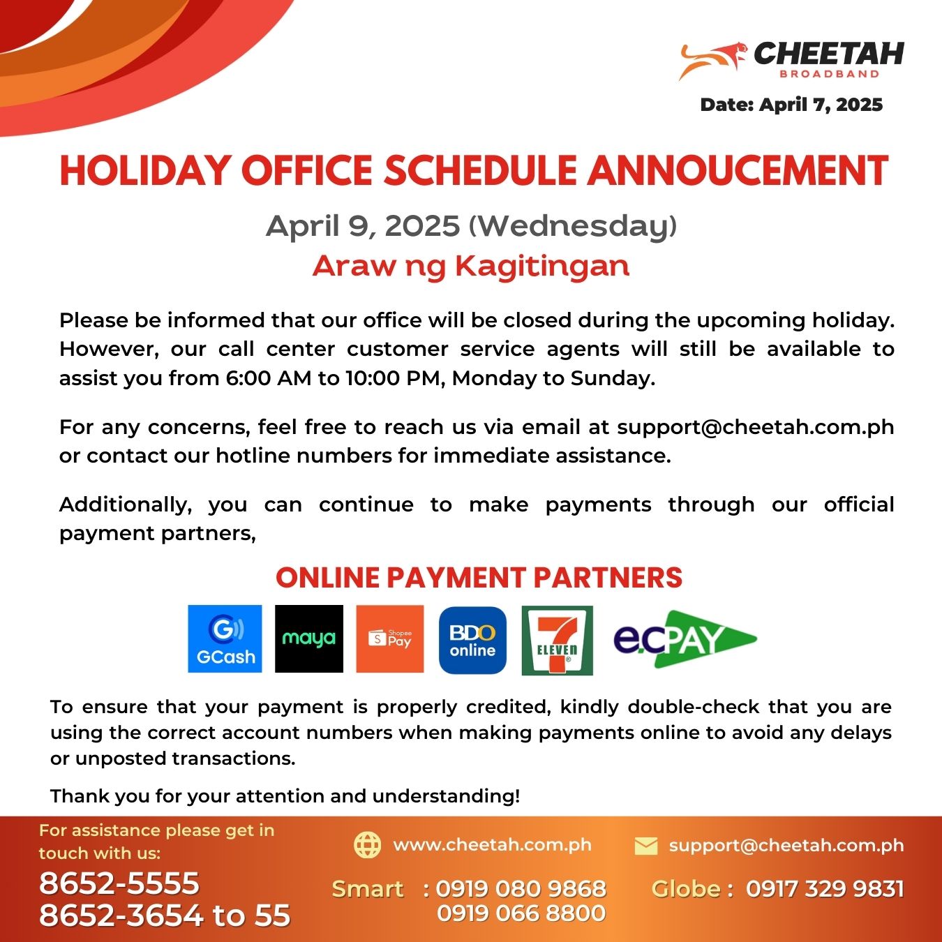 Holiday Office Schedule Announcement In commemoration of Araw ng Kagitingan on April 9, 2025, our office will be closed. Regular operations will resume on April 10, 2025. Let us all take a moment to honor the bravery and sacrifice of our Filipino heroes. Laging handa, laging bayanihan. #ArawNgKagitingan #OfficeAdvisory...
